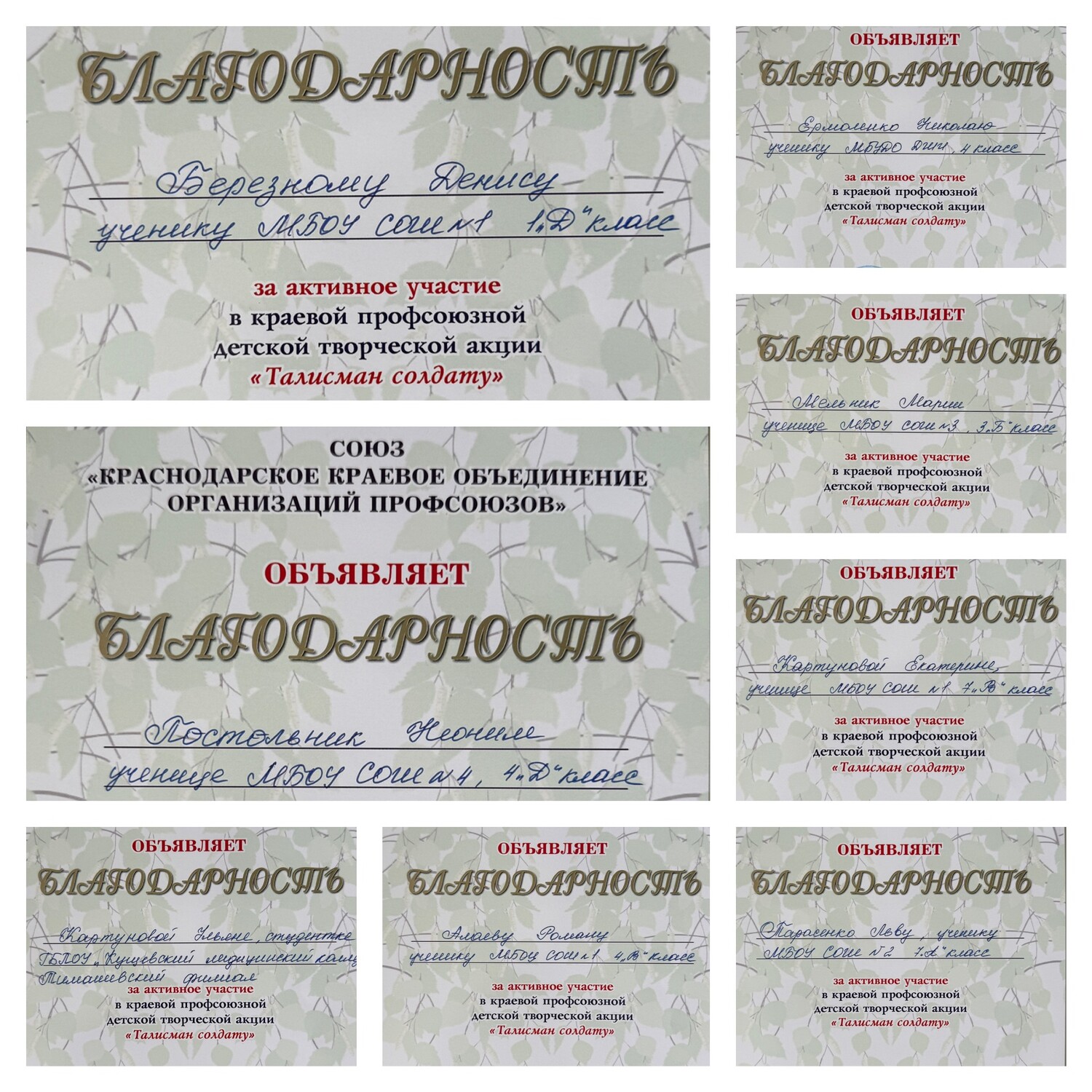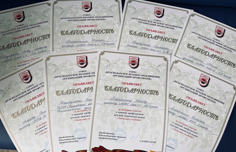 Закончена краевая профсоюзная детская творческая акция «Талисман солдату». От Тимашевской районной организации Краснодарской краевой организации общероссийского профсоюза работников культуры в край было передано 8 поделок от 4 первичных организаций. Все участники акции получили благодарность от председателя Союза «Краснодарское краевое объединение организации профсоюзов» – Светланы Викторовны Бессараб. От своего лица мы благодарим всех участников творческой акции, которые отдали частички своего таланта нашим бойцам на СВО. | |