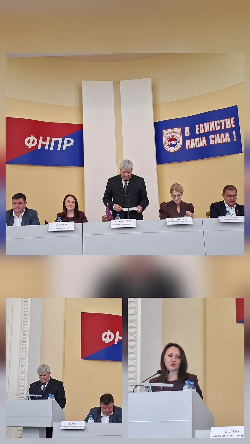 31 марта 2026 года состоялся II пленум Краснодарской краевой организации Общероссийского профсоюза работников культуры. В большом зале Дома союзов собрались представители всей районных и городских райкомов Краснодарского края. В президиуме пленума почетные места наняли заместитель министра культуры Краснодарского края – Батура А.А., председатель Краснодарского краевого профобъединения – Бессараб С.В., председатель крайкома профсоюза – Семихатский В.А., заместитель председателя – Котричева В.Г. и Балышкин Е.Г. – член президиума крайкома профсоюза работников культуры. Доклад об итогах деятельности Краснодарской краевой организации Общероссийского профсоюза работников культуры зачитал председатель крайкома профсоюза – Семихатский В.А. Василий Александрович особо отметил рост заработной платы, по сравнению с 2024 годом, на 9,7%. Повысился процент оздоровления членов профсоюза и их детей, а так же существенно снизился рост травматизма в отраслях, входящих в профсоюз работников культуры. | |